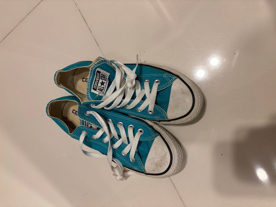 Mavi Converse kadın spor ayakkabısı, düz tabanlı kauçuk taban ve rahat athleisure tarzıyla günlük kullanıma uygun pastel tonlarda.