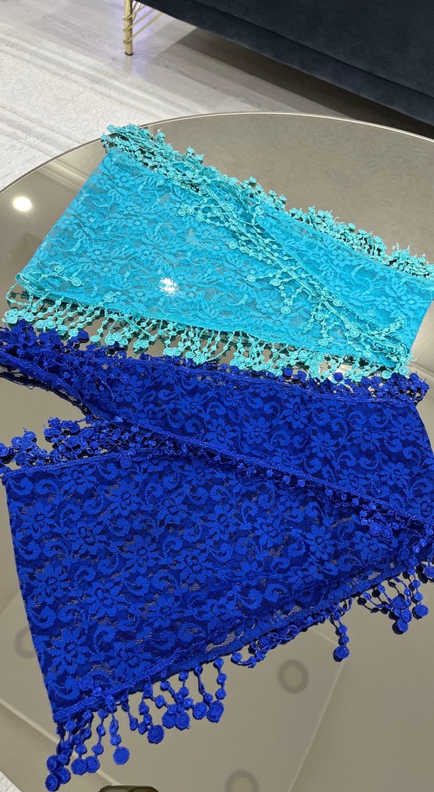 Kadınlar için renkli mavi dantel kumaştan yapılmış, bohem tarzını yansıtan hafif ve dekoratif fular, püskül detaylıdır.