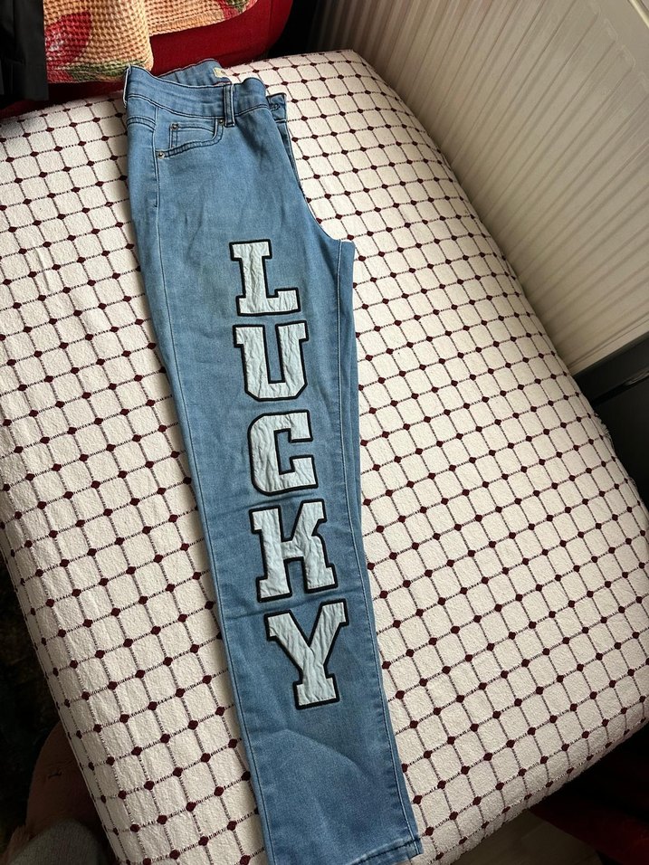 Renkli baskılı harfler ve dantel detaylı, regular fit mavi denim kadın jean. Sokak stili ve günlük kullanım için uygun.