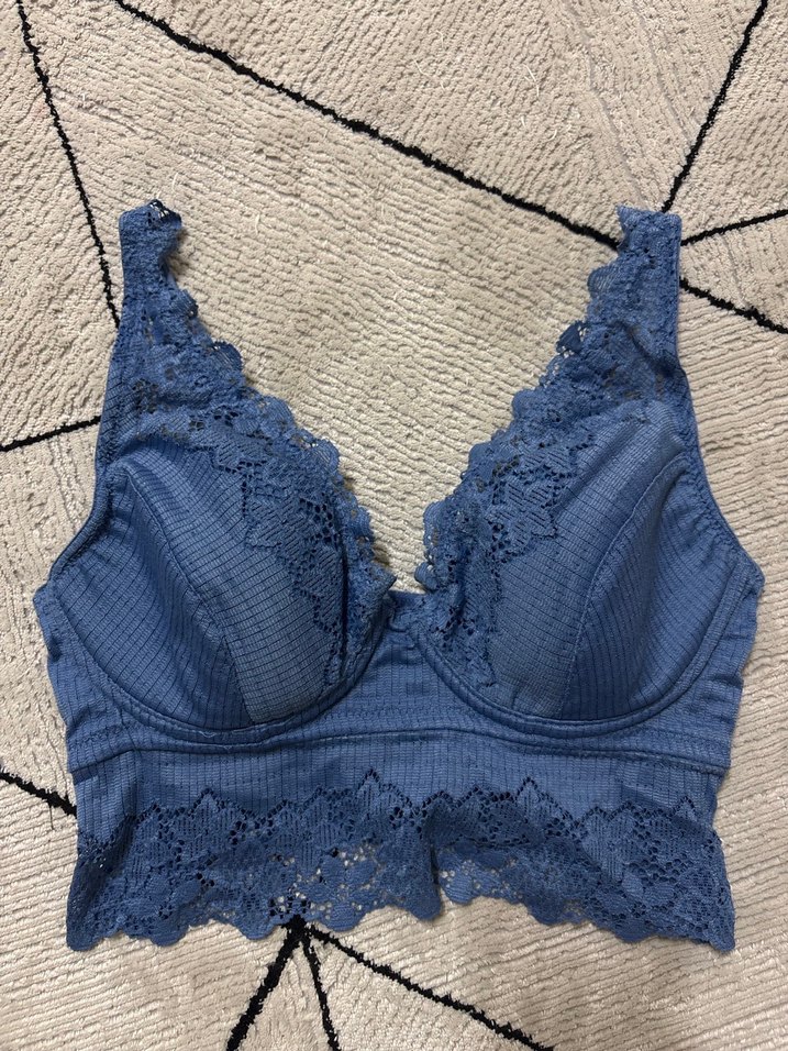 Mavi renkte, dantel detaylı ve kabartmalı dokulu bohem tarzda rahat kesime sahip bralet. Rahat bir görünüm için uygundur.