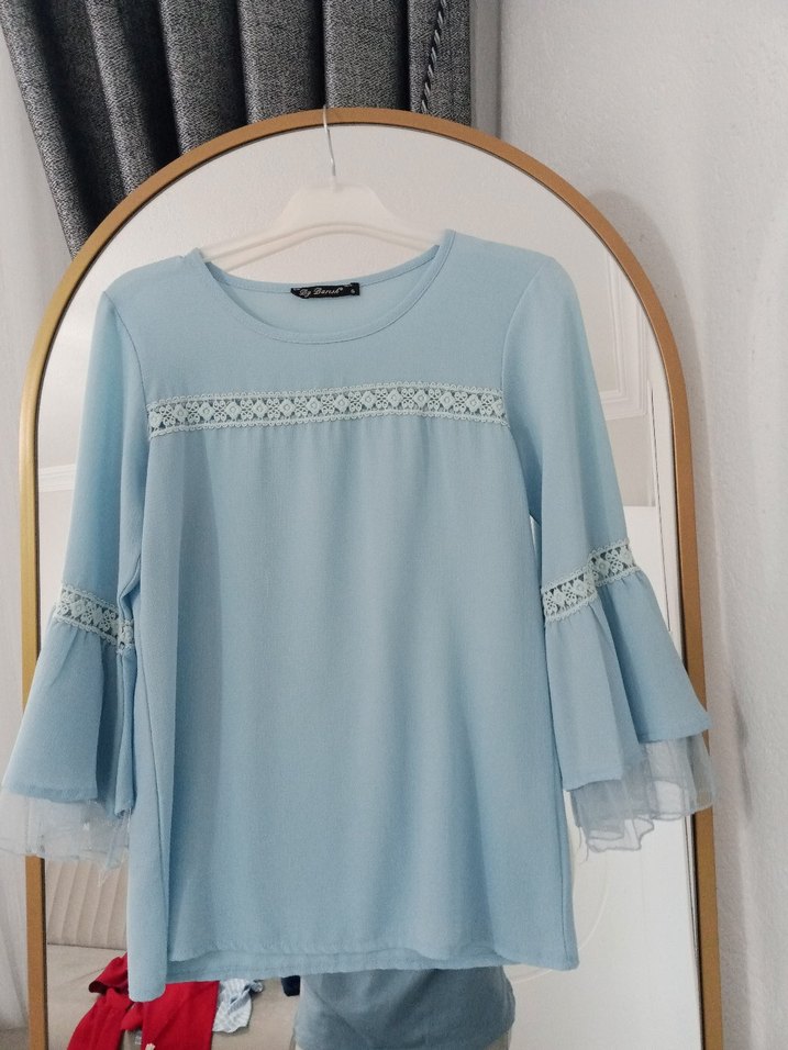Pastel mavi renkte, dantel detaylı uzun kollu, pamuklu kumaştan rahat ve bol kesim kadın bluz. Yuvarlak yaka ve midi boyda, gündelik kullanıma uygun.