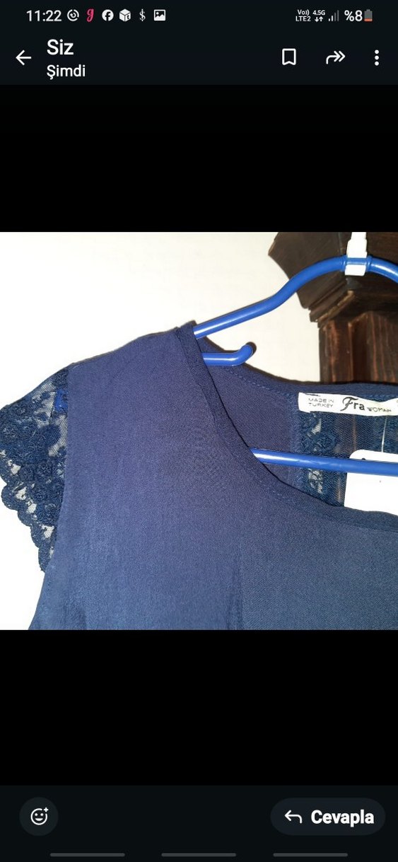 Koyu mavi renkte, yuvarlak yakalı ve dantel detaylı kısa kollu bluz. Gevşek kesim ve kısa boyda, bohem ve Paris etkisiyle günlük şıklık sağlar. Sentetik kumaştan üretilmiştir.