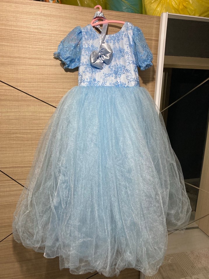 Mavi renkte, kısa kollu ve dantel detaylı, bohem tarzda, tekne yaka, baskılı üst kısmı ve tül etekli çocuk elbisesi.