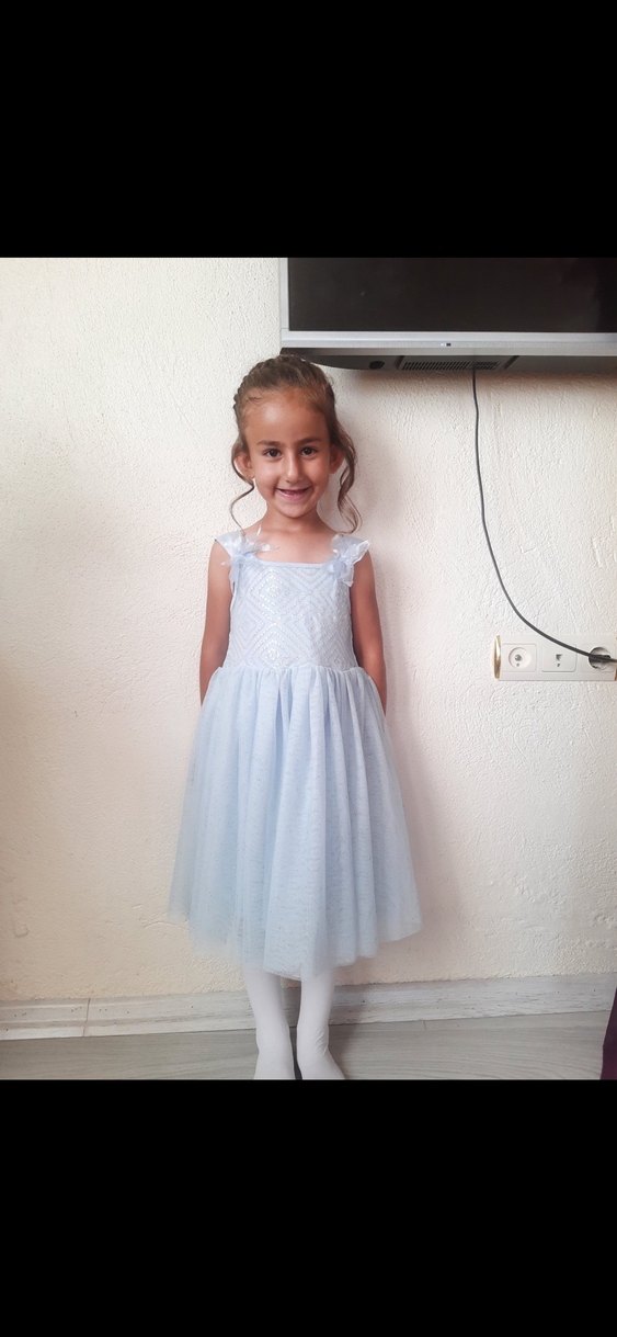 Pastel mavi renkli, dantel işlemeli ve ince askılı, yumuşak triko kumaştan yapılmış klasik şıklıkta kız çocuk elbisesi.
