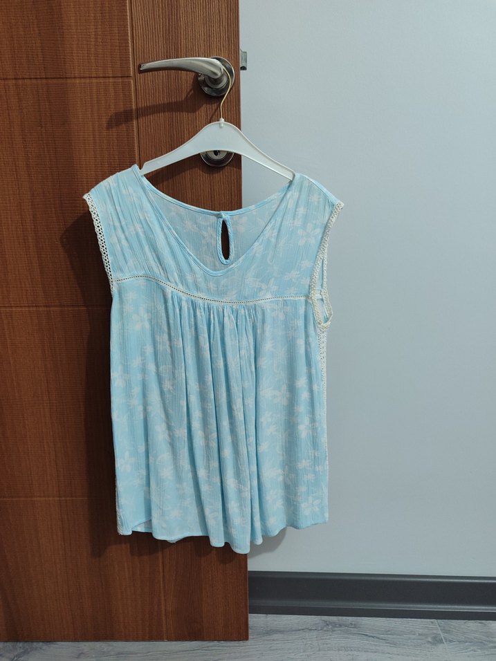 Mavi pastel tonlarda, kolsuz, V yaka, bol kesim ve kısa boyda keten kumaştan yapılmış, dantel detaylı bohem tarzı bluz.