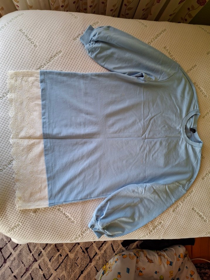 Uzun kollu, bisiklet yaka, bol kesim mavi tunik. Alt kısmında dantel detayı bulunur. Günlük kullanıma uygundur.