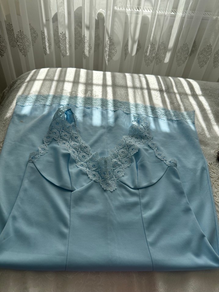 Fitted kesim, kolsuz kadın gecelik; pastel mavi renkte, narin dantel detaylıdır. Uzun boy ve vintage bohem tarzıyla şık ve rahat bir seçenek sunar.