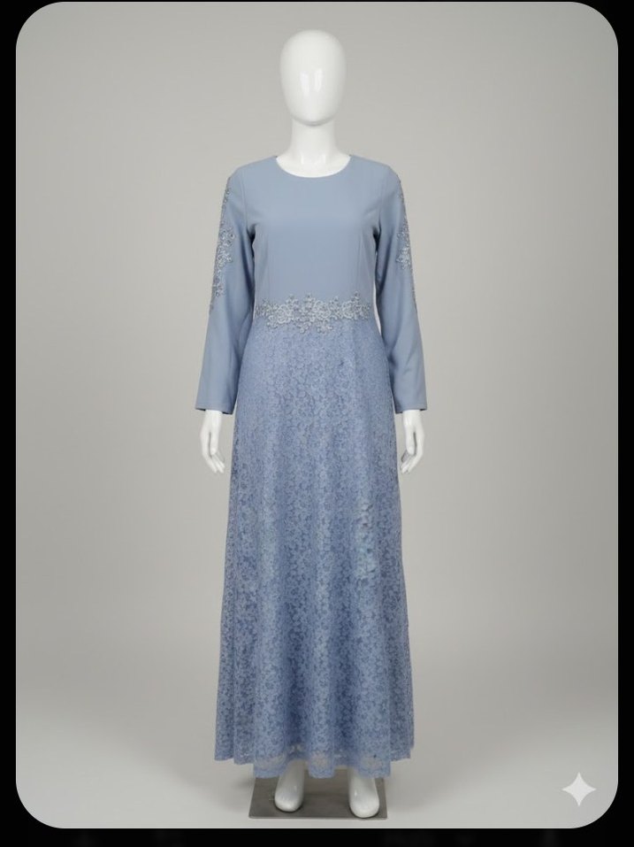 Mavi Dantel Detaylı Uzun Kollu Abiye Elbise