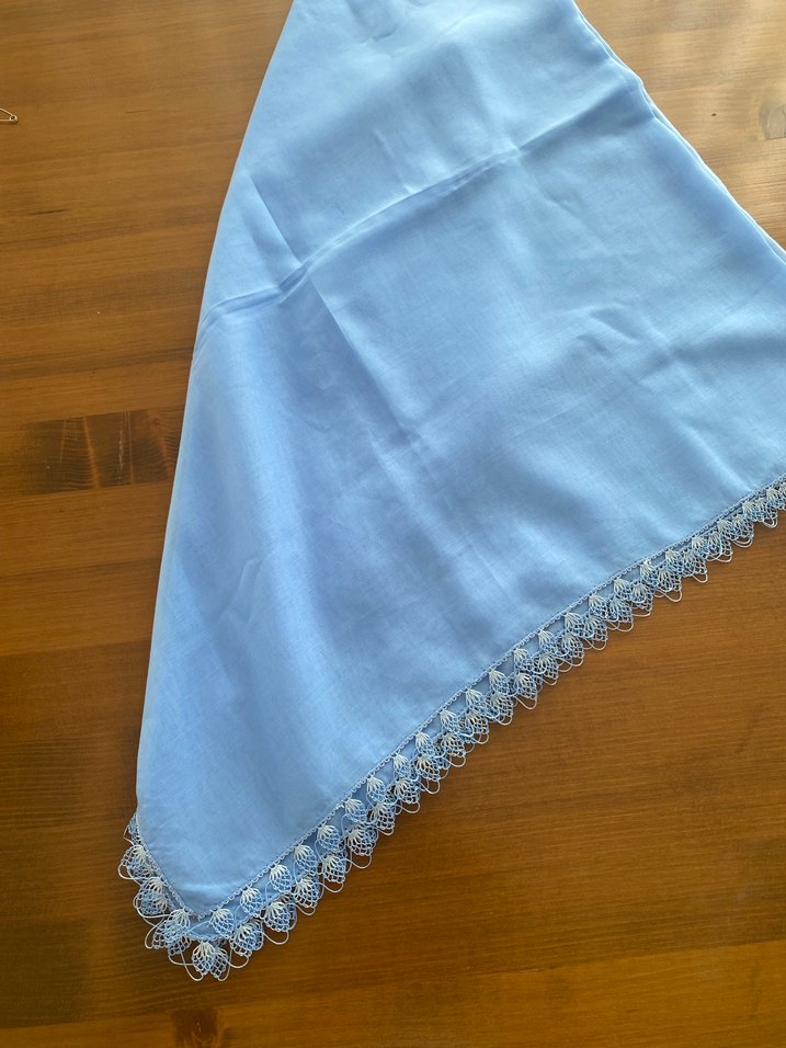 Pastel mavi renkte, dantel kenarlı ve drapeli kadın şalı. Vintage ve sade tarzda, tekstil kumaştan üretilmiştir.