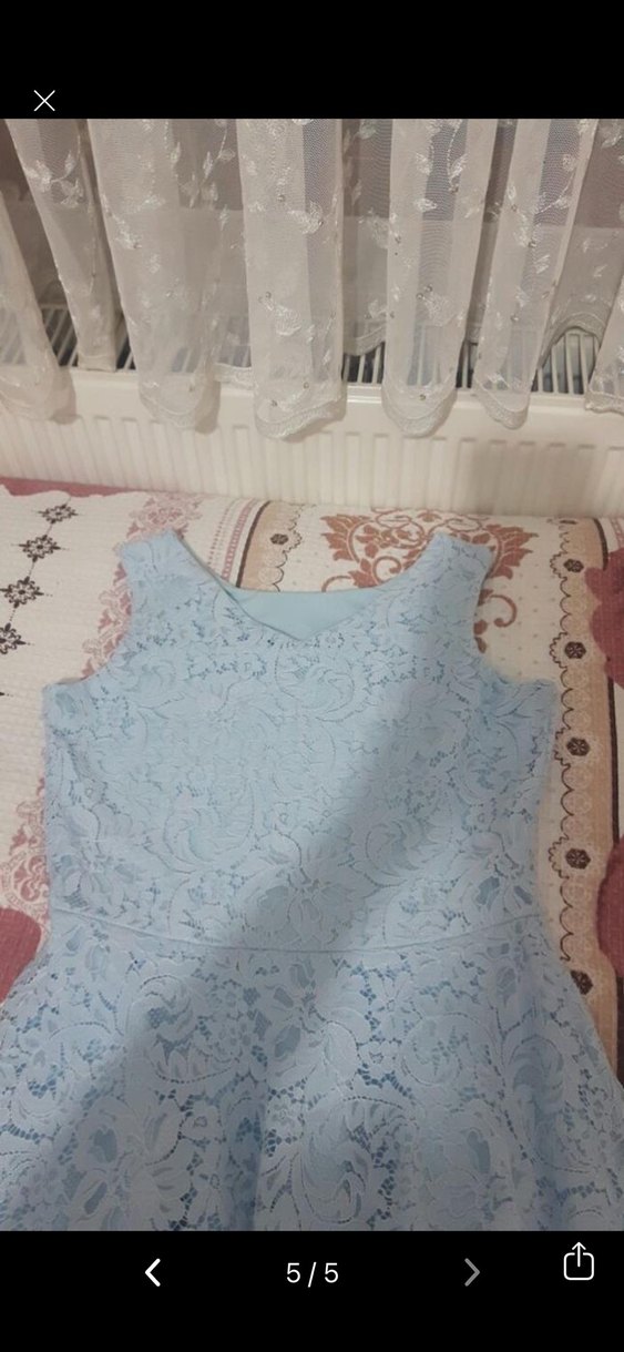 Mavi dantel detaylı, kolsuz mini abiye elbise. V yakalı, vintage bohem tarzda, vücuda oturan kesime sahiptir. Bir kez giyildi