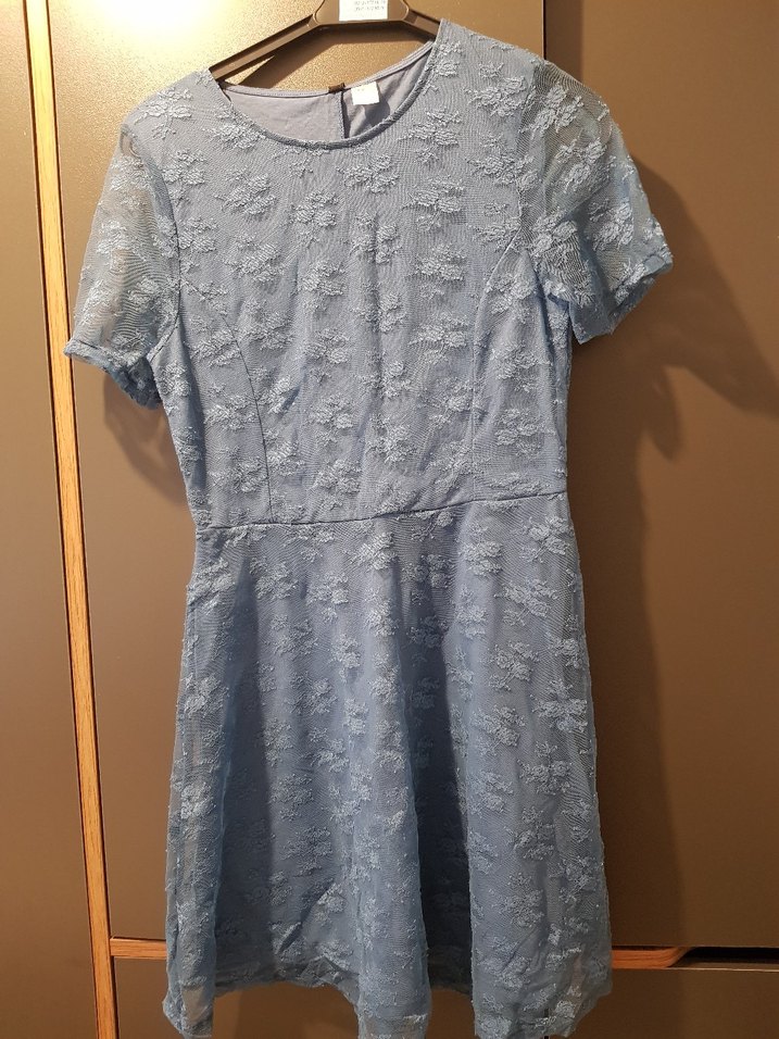 mavi Renkli, kısa kollu, yuvarlak yakalı ve dantel kumaştan yapılmış bol kesim midi elbisedir. Ofis ve günlük kullanıma uygundur.