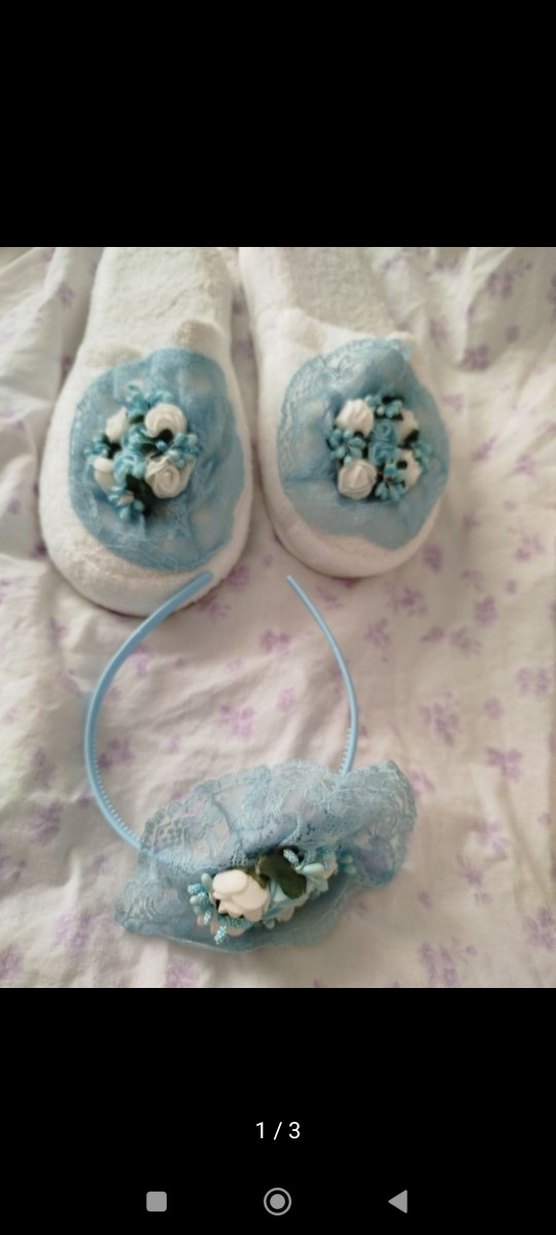 Bohem tarzda, pastel mavi renkte dantel ve nakış detaylı erkek aksesuar seti; taç ve çiçek işlemeli terliklerden oluşur.