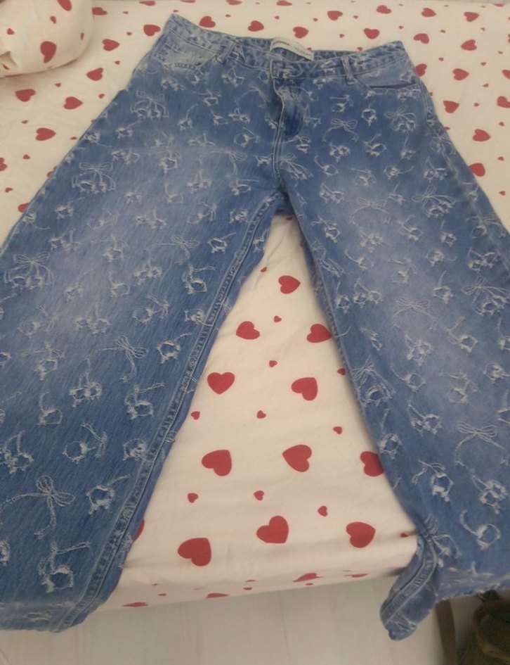 Mavi renkli, bağlama desenli ve dantel detaylı rahat kesim kadın kot pantolon, bohem ve retro tarzıyla günlük kullanım için uygundur.