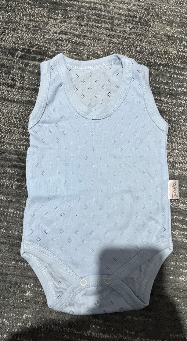 Mavi renkli, dantelli, kolsuz bebek erkek body. V yakalı, hafif sentetik kumaştan üretilmiş, alt kısmı çıtçıtlıdır. Rahat kullanım sağlar.