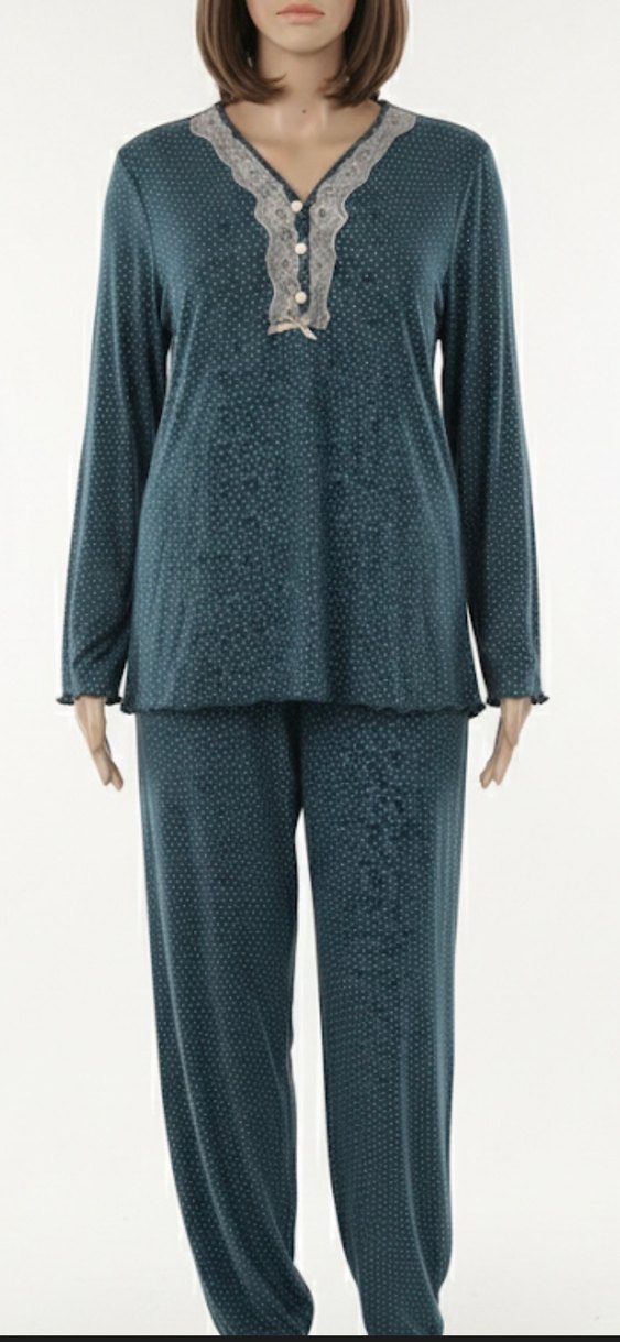 Mavi, dantelli büyük beden pijama takım