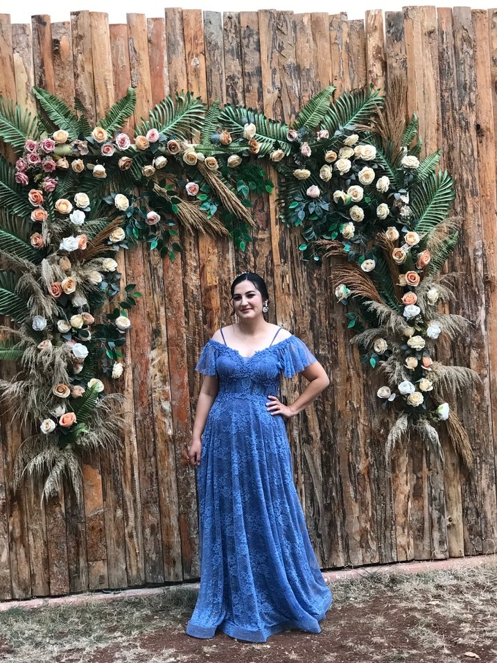 Mavi, uzun ve bol kesim elbise dantel detaylıdır. Askılı kol ve straplez yakaya sahiptir. Parlak batik desenlidir, bohem düğünler için uygundur. 1 defa giyildi