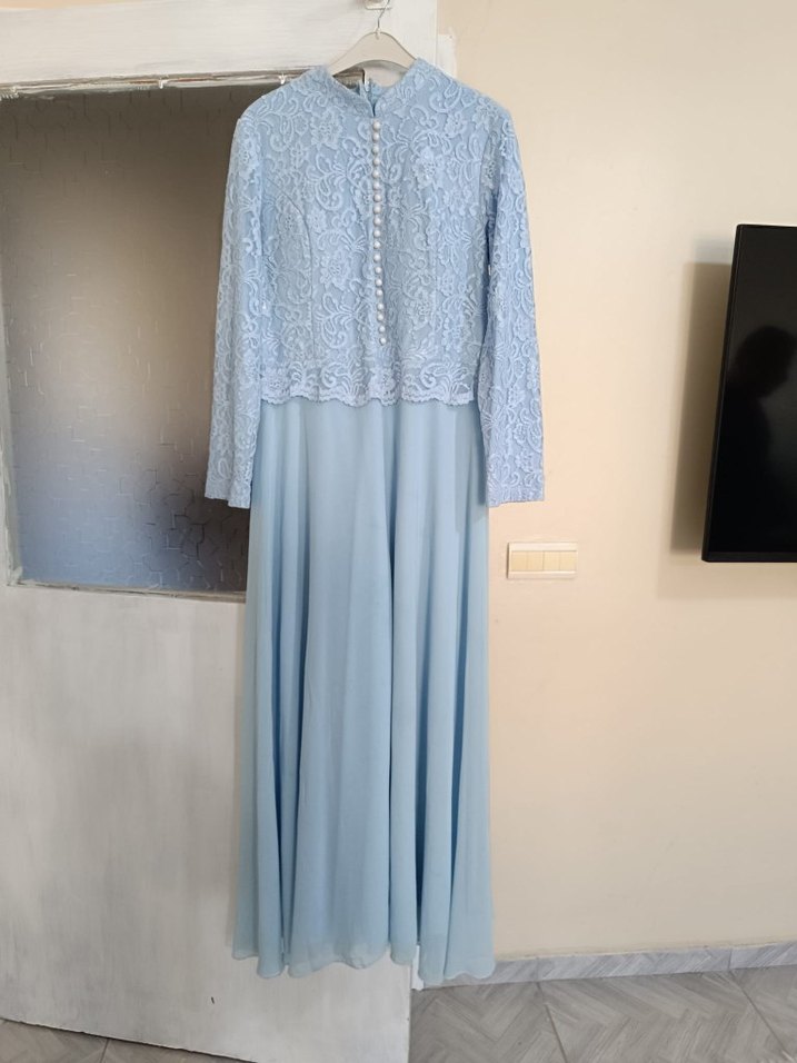 Pastel mavi renkte, uzun kollu, dantelli, yuvarlak yakalı klasik tarzda vintage abiye elbise. Düğmeli detaylı, regular fit, düğün için uygun.