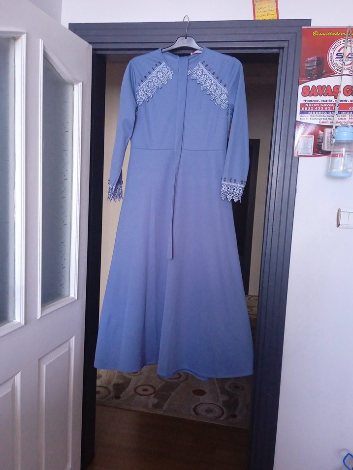 Mavi renkte, dantelli detaylara sahip uzun kollu ve bol kesim uzun elbise. Yumuşak ve sıcak kumaştan, sade ve vintage tasarımlı günlük kullanıma uygun bir modeldir.