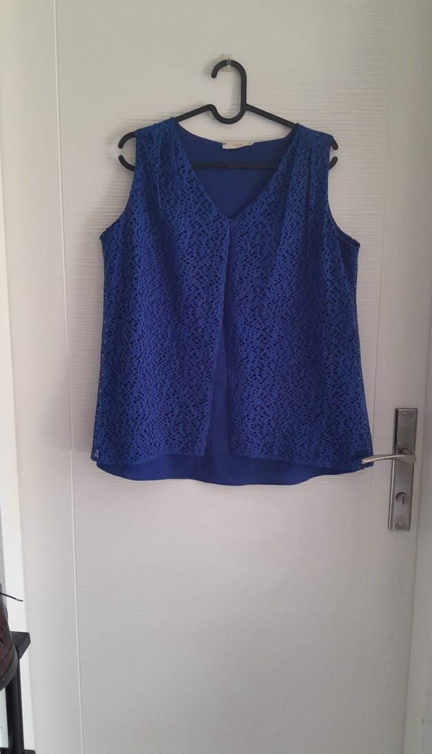 Kolsuz, V yakalı, koyu mavi dantel detaylı ve rahat kesim bluz. Yumuşak triko kumaştan, günlük kullanıma uygun minimal tarzda.