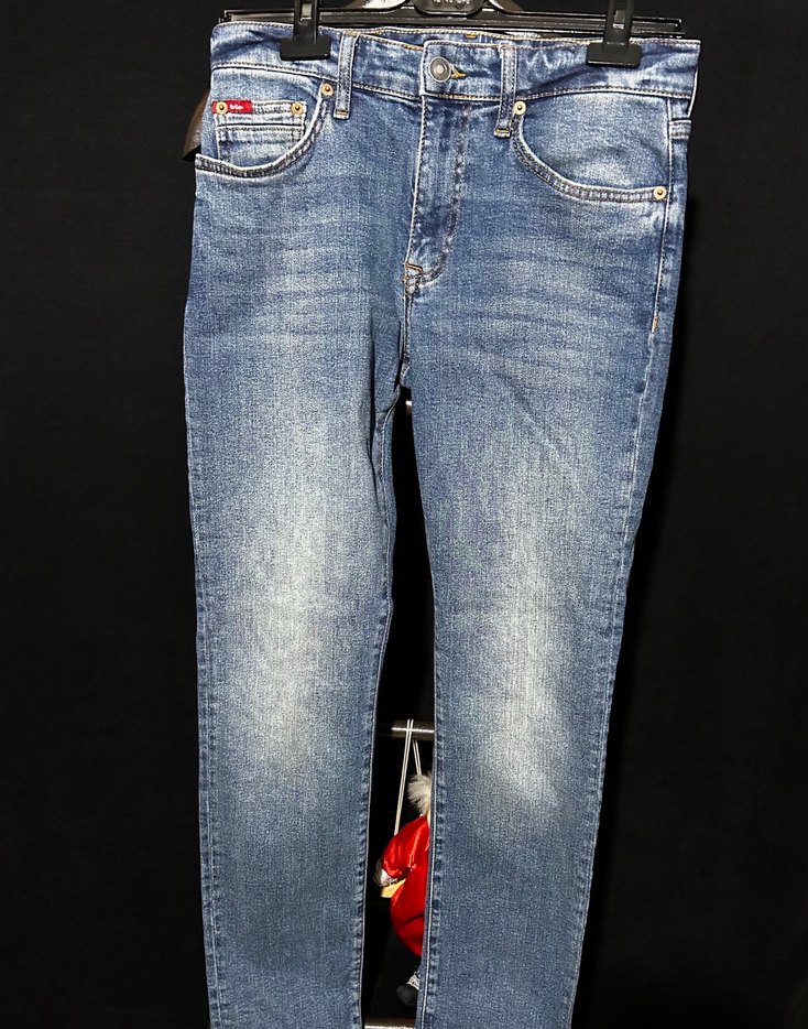 Erkekler için dar kesim, koyu mavi denim kumaştan yapılmış jean. Günlük kullanım için uygun, normal boyda ve tokalı detaylı.
