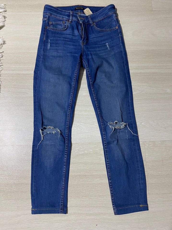 Dar kesim, mavi kot pantolon . Diz kısmında yırtıklar bulunur, günlük kullanıma uygundur.