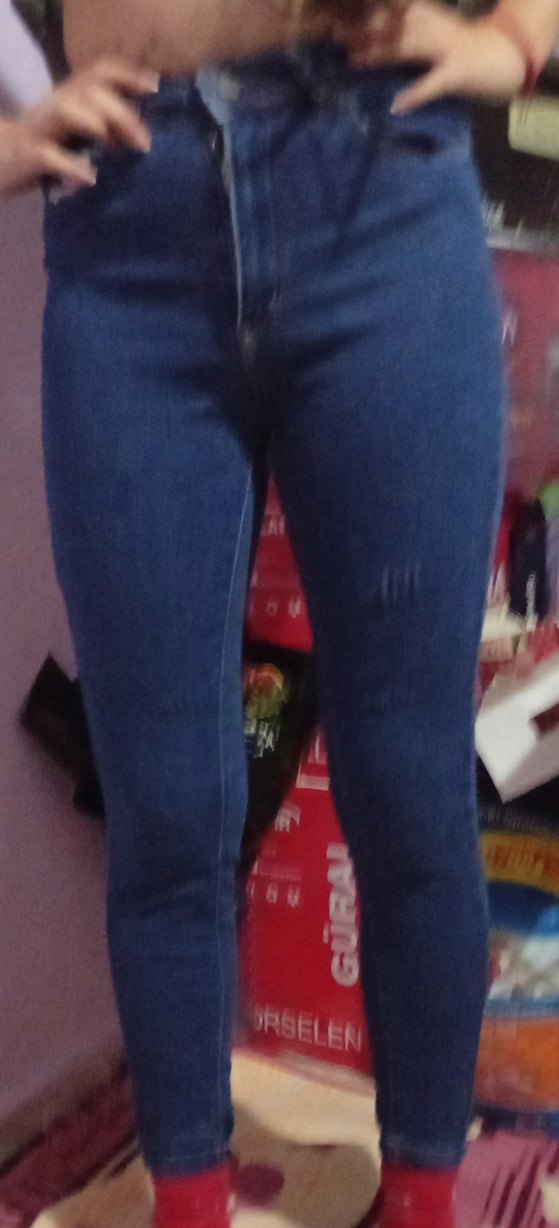 Mavi renkli, dar kesim, midi boy kot pantolon. Tokalı tasarıma sahip, günlük rahat sokak stili için uygundur.