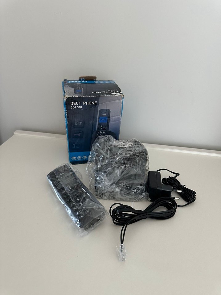 Koyu mavi renkte DECT kablosuz telefon, ahize, şarj standı, adaptör ve telefon kablosu ile birlikte.
