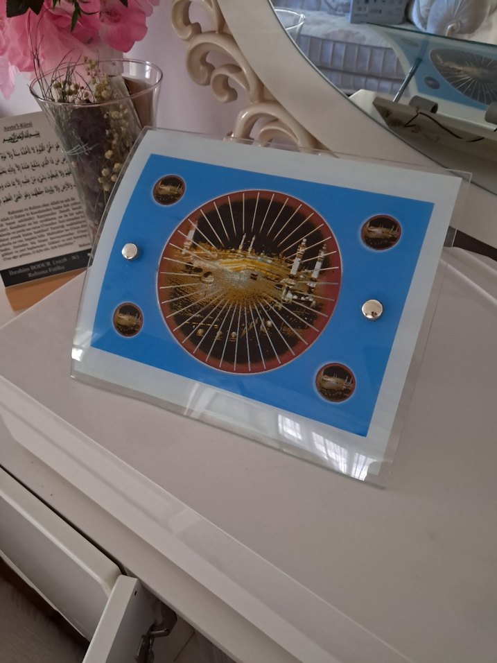 Mavi çerçeveli, dairesel ızgaralı küçük dekoratif gece lambası Ortasında dört küçük dairesel görsel bulunan vintage tasarım.