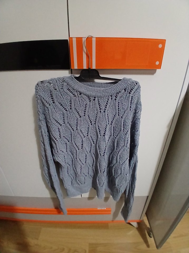 Gri renkli, örgü dokuma kazak, yuvarlak yaka ve uzun kolludur. Rahat, kısa kesimiyle günlük kullanıma uygundur.