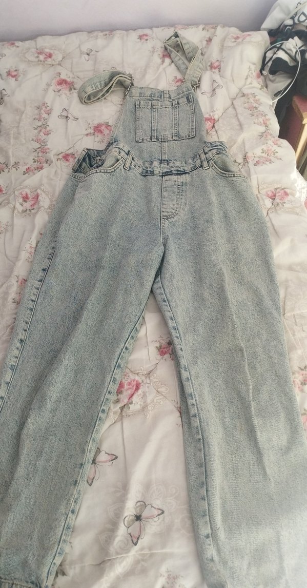 Bol kesim mavi denim tulum, ayarlanabilir tokalı askılar ve askısız yaka ile vintage tarzda. Günlük kullanıma uygundur. hafif solmus durumda zayıfladıgim için büyük geliyor