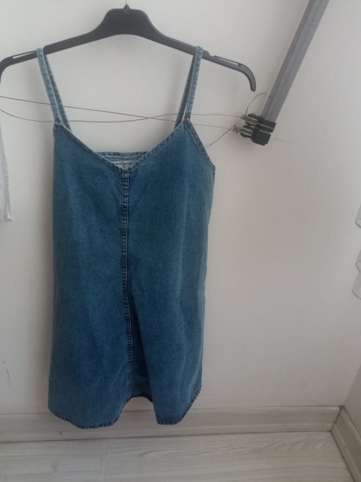 Mavi denim askılı midi elbise, bol kesim ve askısız yaka ile günlük sokak modası için uygun. Basit ve şık, günlük kullanım için ideal.