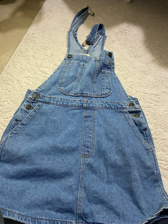Mavi denim askılı midi salopet, bol kesim ve askısız yakaya sahip. Tokalı askılar ve ön cep detayları ile günlük rahat kullanıma uygundur. kusuru yok giyilmedi