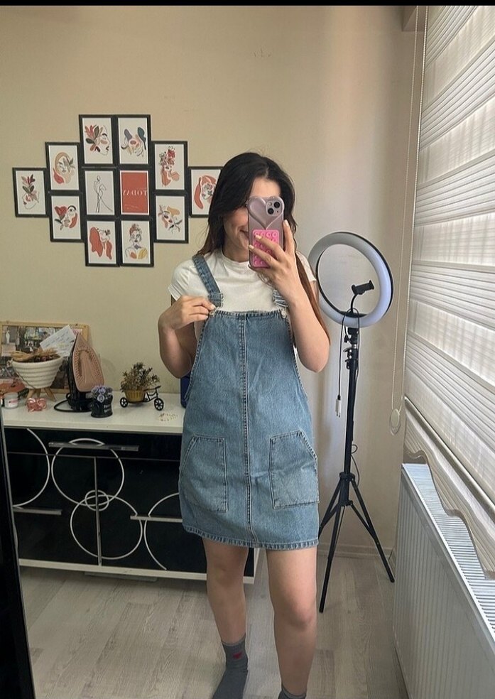 Mavi denim midi tulum, askılı ve kolsuz tasarımıyla rahat ve salaş bir görünüm sunar. Günlük kullanım için uygun, salaş kesim ve tie-dye deseniyle trend bir stil sağlar.