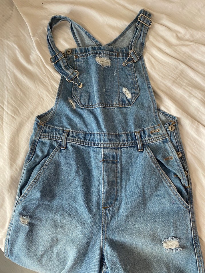 Askılı, tokalı ve bol kesim mavi denim kız tulumu. Sokak stiline uygun, yırtık detaylı rahat bir model.s/xs bedene uyumlu