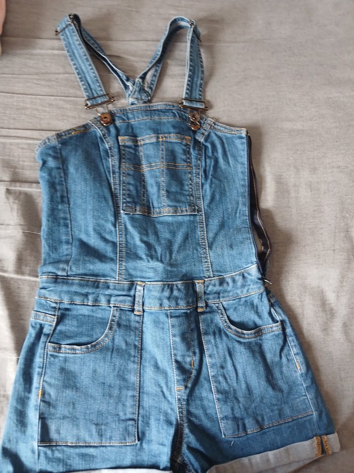 Ayarlanabilir tokalı askıları ve ön cepleri olan, sokak modasına uygun, fitted kesim mavi denim kız tulumu.