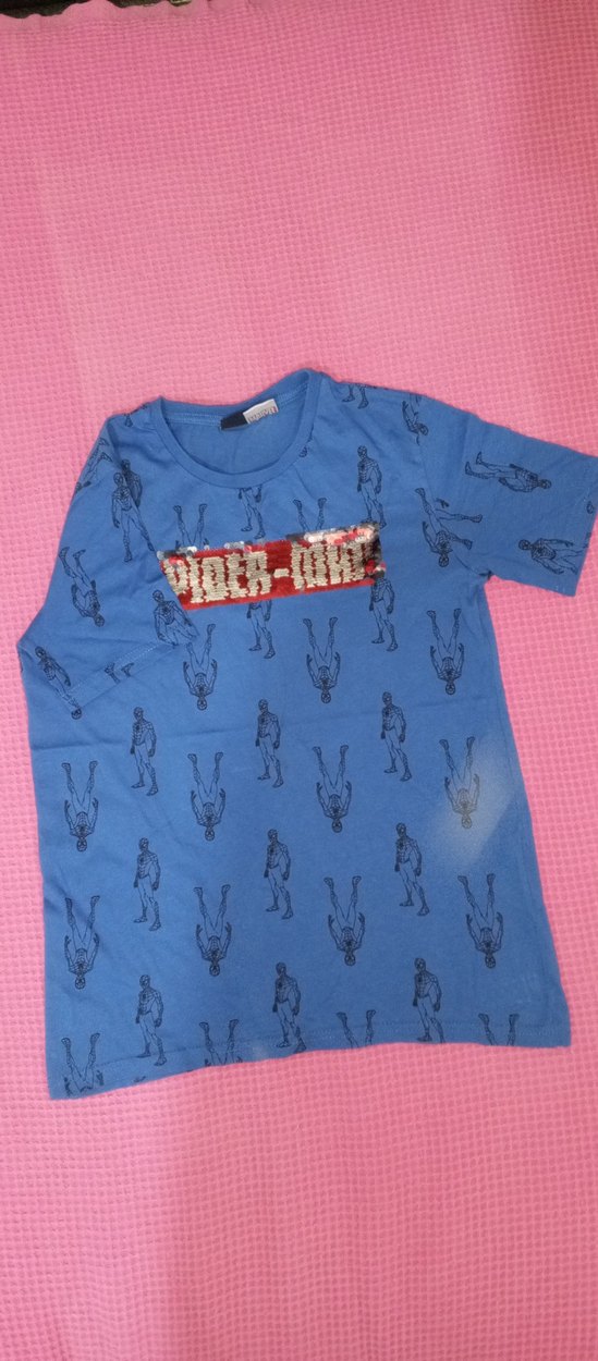 Rahat kesim mavi denim erkek çocuk tişörtü, renkli baskılı desen ve bisiklet yaka ile. Kısa kollu, rock punk tarzını yansıtır.