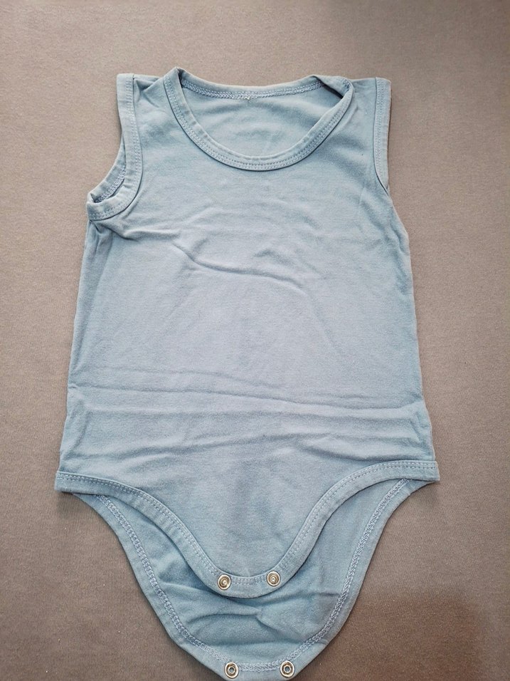 Mavi denim kumaştan, kolsuz, yuvarlak yakalı, çıtçıtlı bebek erkek body. Sade ve normcore tarzda.