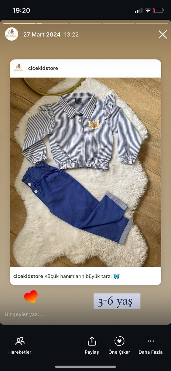 4 ve 5 yaş mevcuttur Parlak mavi denim pantolon ve yaka detaylı, düğmeli uzun kollu gömlekten oluşan 3-6 yaş bebek kız takımı. Üst kısmı çizgili ve fırfırlı detaylıdır.
