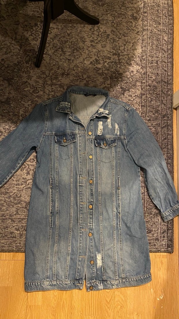 Mavi renkli, düğmeli ön kısmı, uzun kollu ve yakalı, salaş kesim midi uzunluğunda denim ceket. Günlük rahat kullanıma uygun.