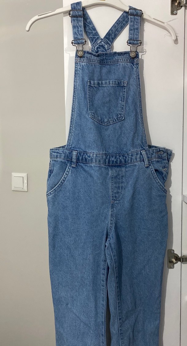 Mavi denim kumaştan, tokalı askılı, cep detaylı, rahat kesim midi uzunlukta kadın salopet. Günlük sokak stiline uygun pastel tonlarda.