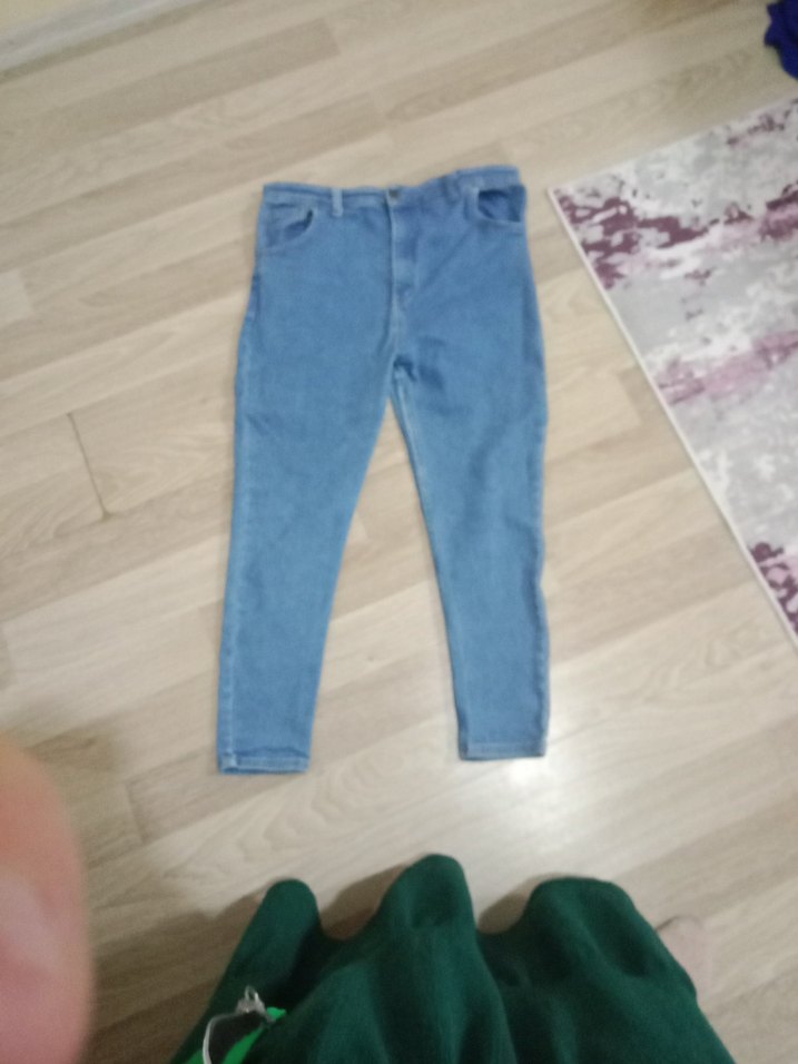 Mavi denim kumaştan, dar kesim ve midi boy pantolon. Günlük kullanıma uygun, rahat ve şık sokak stili sunar.