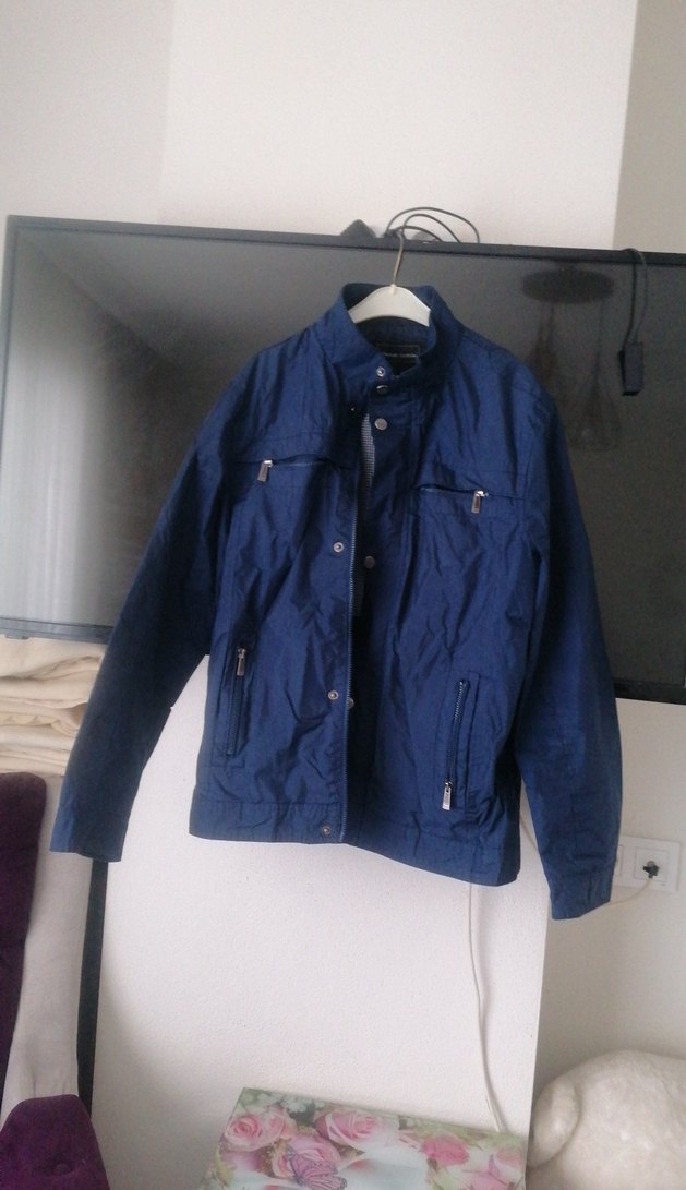 Düğmeli ön kapama, uzun kollu ve normal kesim erkek ceket. Parlak mavi renkli denim kumaştan, çıtçıtlı yakalı ve çoklu fermuarlı cepler içerir.
