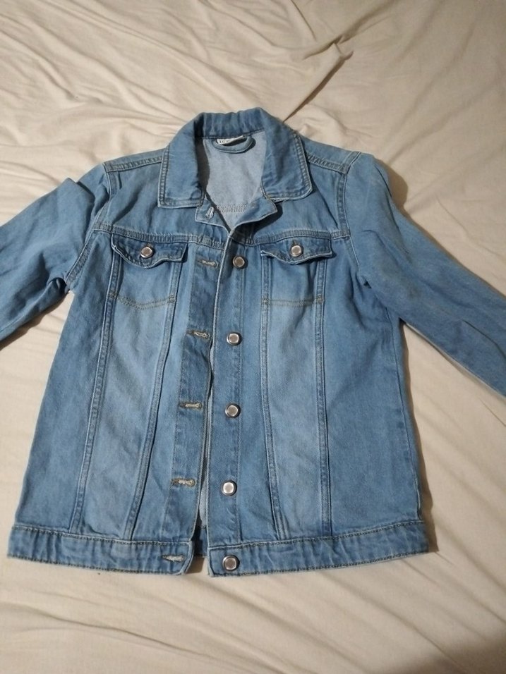 Mavi denimden yapılmış, düğmeli, uzun kollu ve notlu yakalı, bol kesim rahat kadın ceketi.