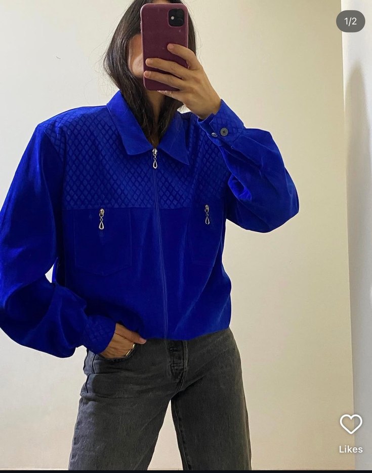 Mavi denim kumaştan, uzun kollu ve yakalı, düğmeli kadın ceket. Salaş kesimi ve midi boyuyla günlük sokak stili için uygundur. Kaula Vintage’dan satış almıştım. #vintage