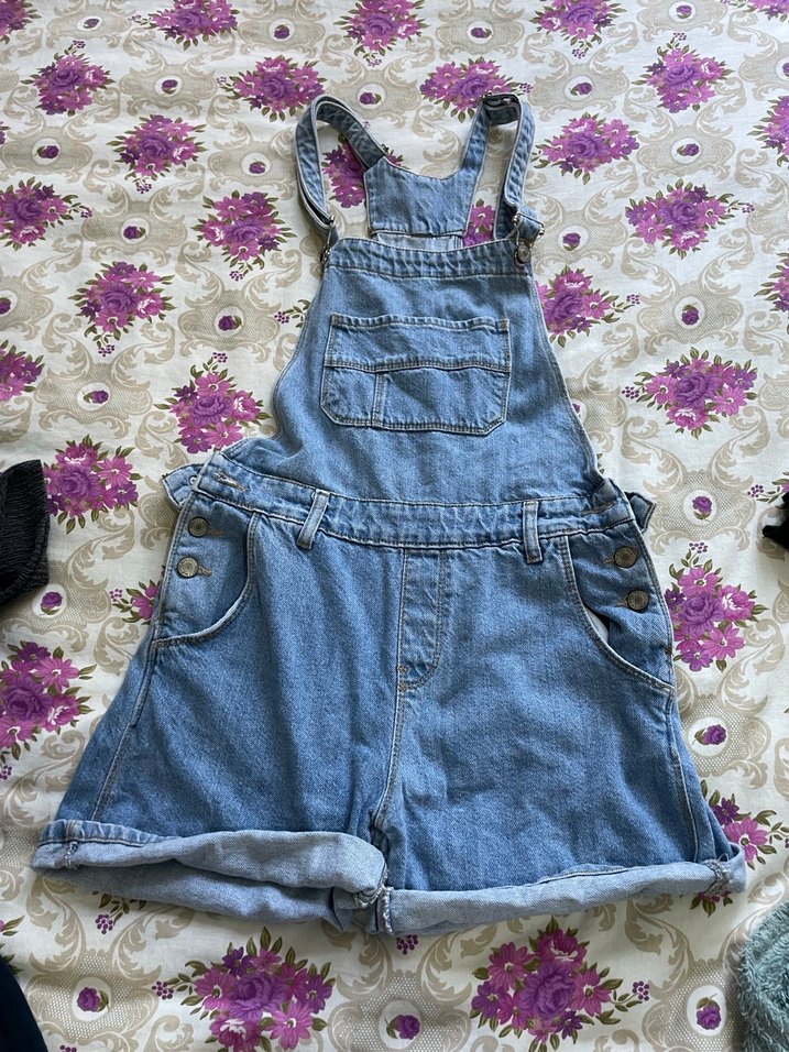 Düğmeli, cepli ve ayarlanabilir askılı, bol kesim mavi denim kadın şort tulum. Günlük kullanıma uygun rahat bir tarza sahiptir.