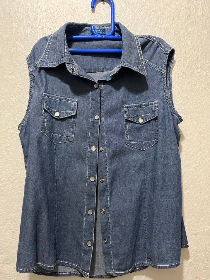 Mavi denim kolsuz gömlek, yakalı ve düğmeli ceplidir. Salaş kesim ve normal boyda, gündelik sokak stili için uygundur .