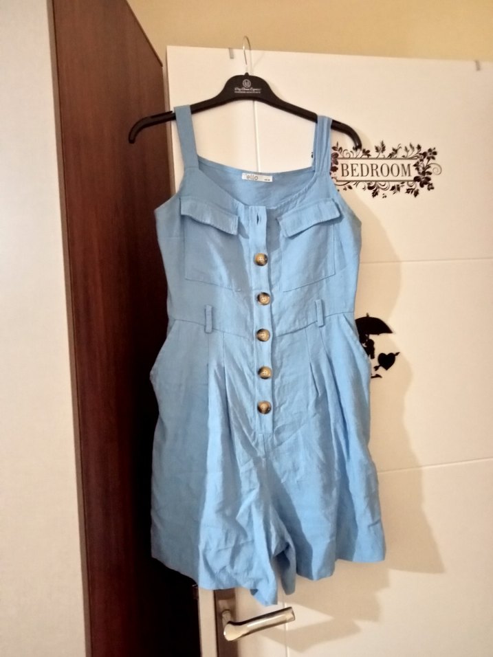 Yumuşak denim kumaştan, düğmeli ve kolsuz tasarıma sahip, rahat kesim mavi tulum. Günlük sokak stili için uygun.