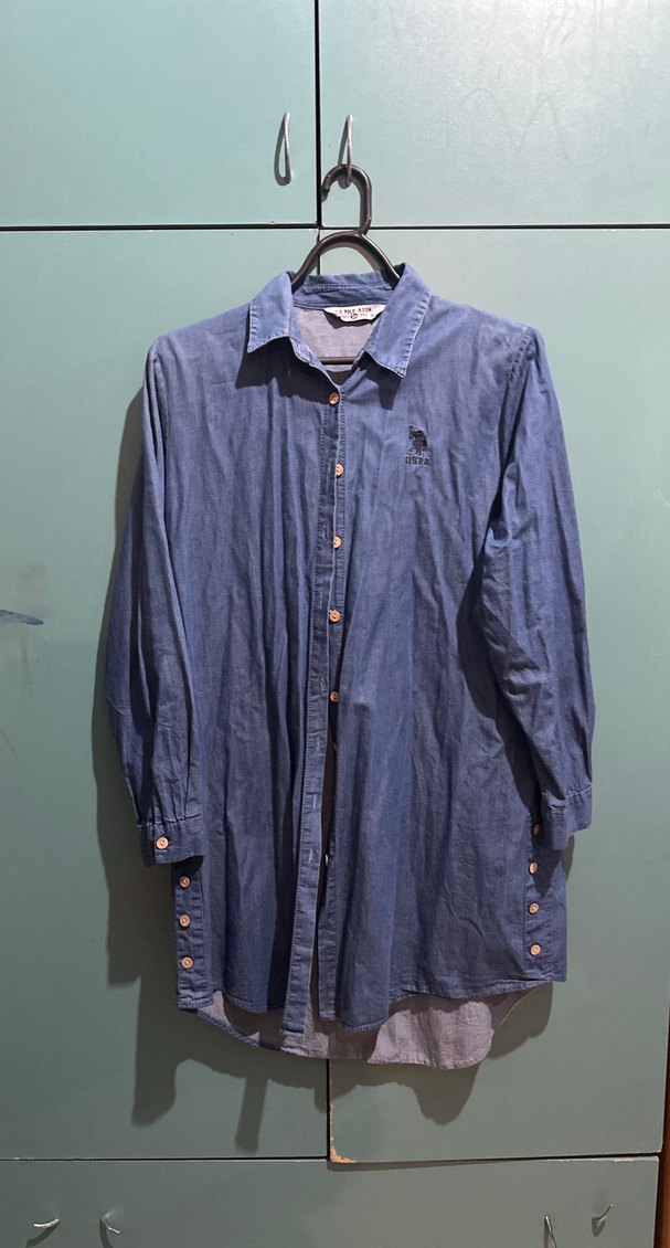 Mavi denim kumaştan, düğmeli kapamalı, uzun kollu, yakası çıtçıtlı ve bol kesim kadın gömleği. Midi boyda, günlük sokak stiline uygun.