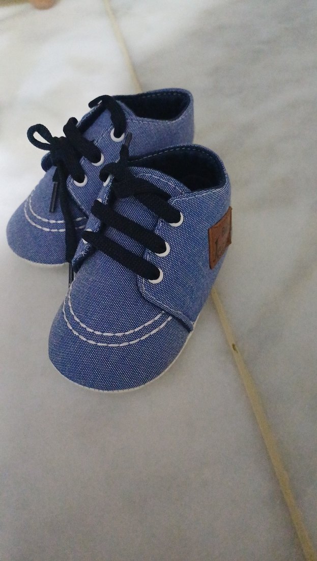 Mavi denim malzemeden erkek bebekler için ilk adım ayakkabısı, sokak stili ve cırt cırtlı kapanışlıdır.