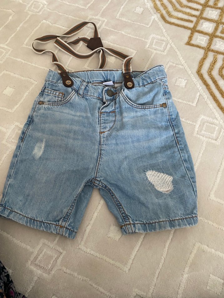 Bol kesim, mavi pastel renkli erkek çocuk denim şort, tokalı askılarla. Hafif yıpranmış görünümlü, rahat sokak tarzı şort.